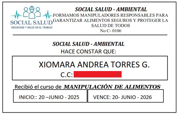 Después de enviarnos tu información (nombre completo, número de documento y comprobante de pago), recibirás tu carnet y certificados en menos de 1 hora, totalmente válidos y avalados para trabajar como manipulador de alimentos en todo el país.